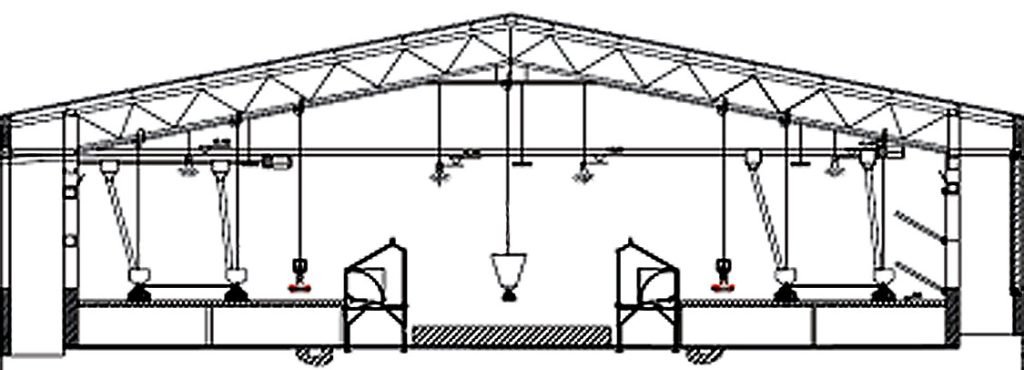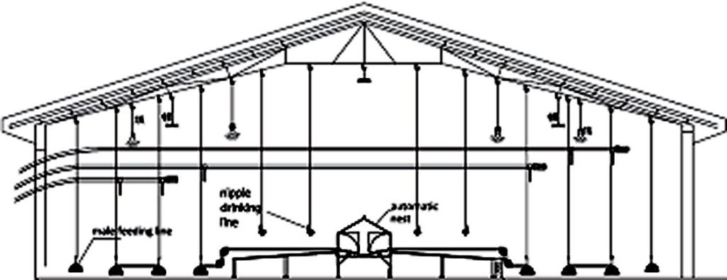 Breeder House System capable of housing 11, 500 females and 1, 725 males (15% of female) in a tunnel ventilated house designed with a HIGH-LOW-HIGH flooring, an auto nest system (situated left and right side of the house-slatted area) and auto feeding system.